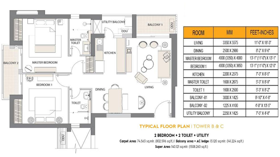 | TYPE | SUPER AREA | CARPET AREA | BALCONY |
